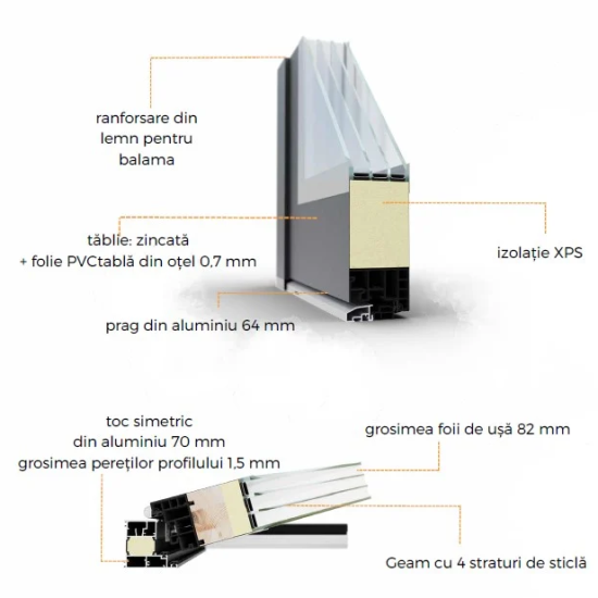 – coeficient de transfer termic 1.1 W/m2K (fără geam) și 0.74 W/m2K (cu geam)